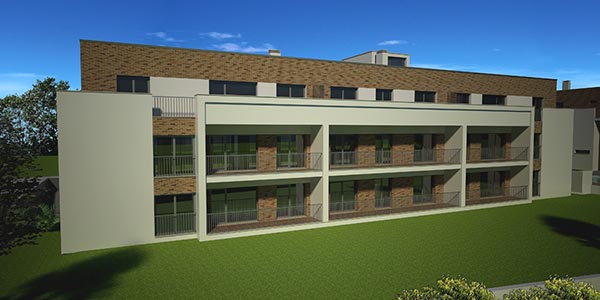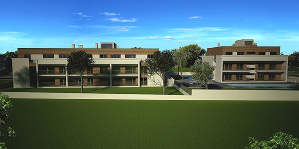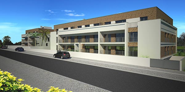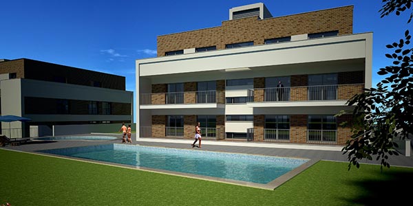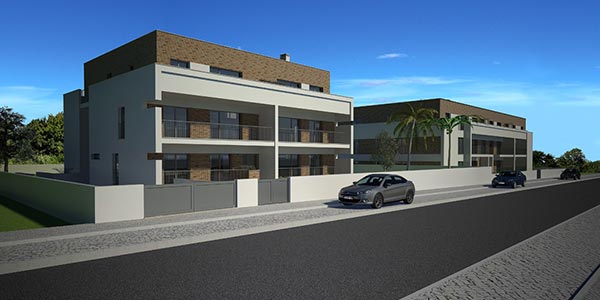 Imagens 3D exteriores de edificios de habitação.
